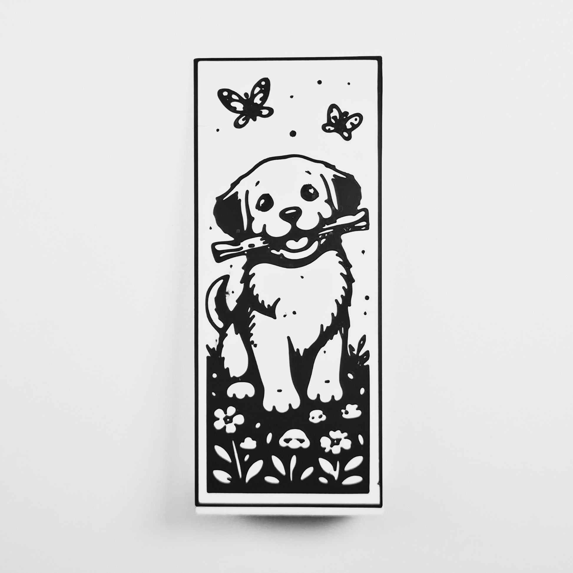The bold black and white contrast gives the design a clean, timeless look while capturing that carefree, tail-wagging joy only a puppy can bring. It’s a lighthearted piece that adds a playful touch to any book.