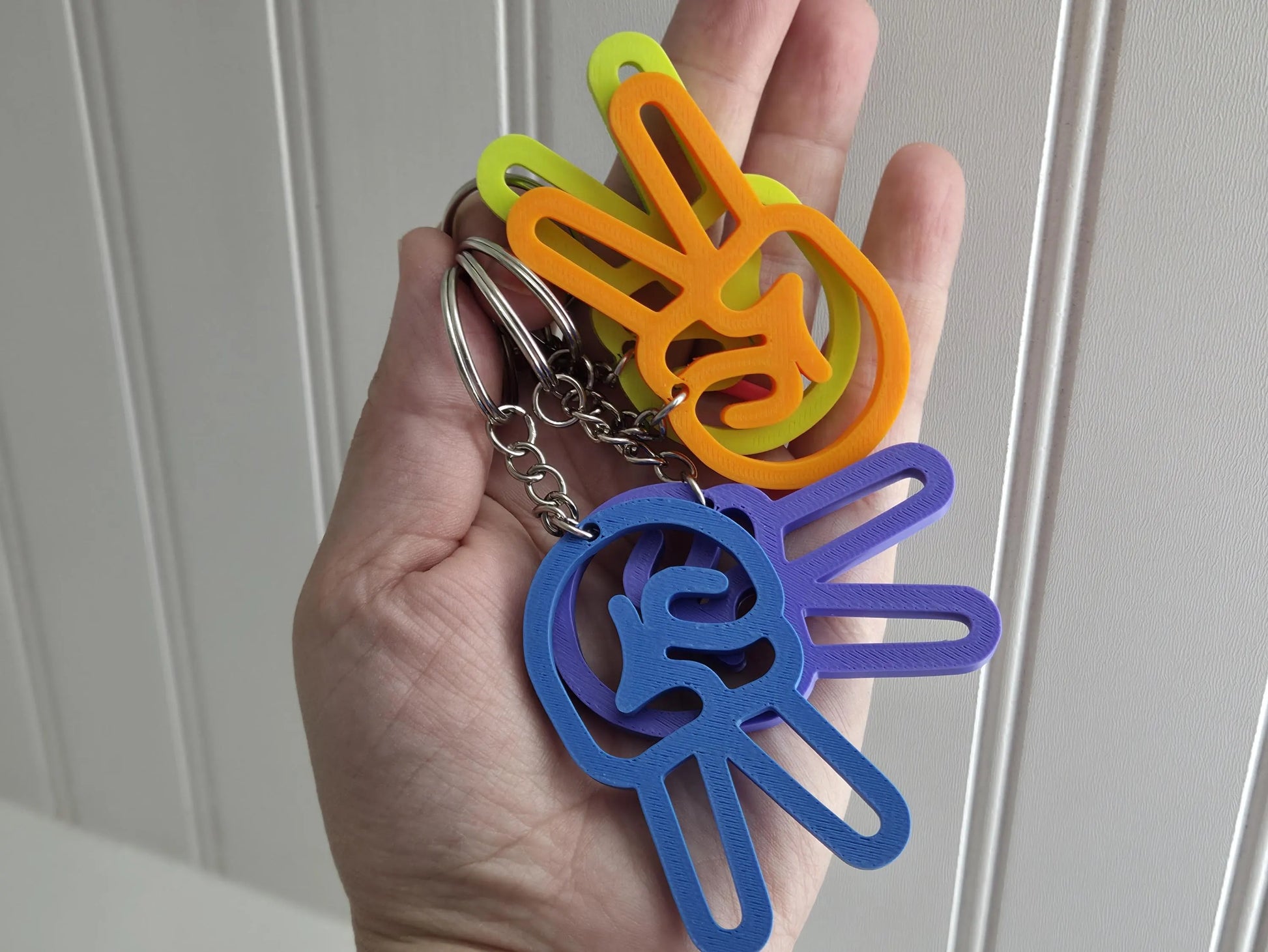 Available in a range of bright colors, each keychain features a bold peace-hand design that captures the spirit of kindness, creativity, and individuality.
